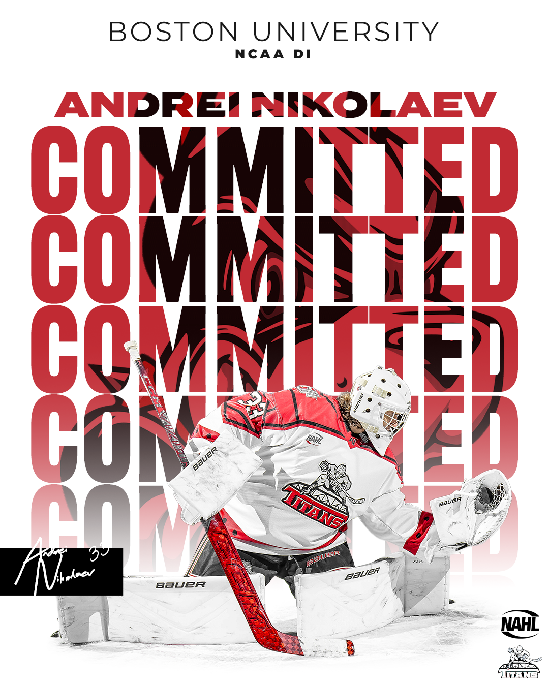The New Jersey Titans are proud to announce the commitment of goaltender Andrei Nikolaev to Boston University. The 16-year-old goaltender made his junior hockey debut in the first game of New Jersey’s season against Elmira, becoming the youngest goaltender to skate in an NAHL game since 2022 and the youngest goaltender in Titans history. Playing in his first season in North American, the Moscow, Russia native has recorded a record 6-3-2, with a goals against average of 2.56 and a save percentage of .918, along with his first shutout against Philadelphia on October 25th. Nikolaev becomes the second Titan in as many years to commit to the Terriers, following defenseman Kyle Kim from last season.